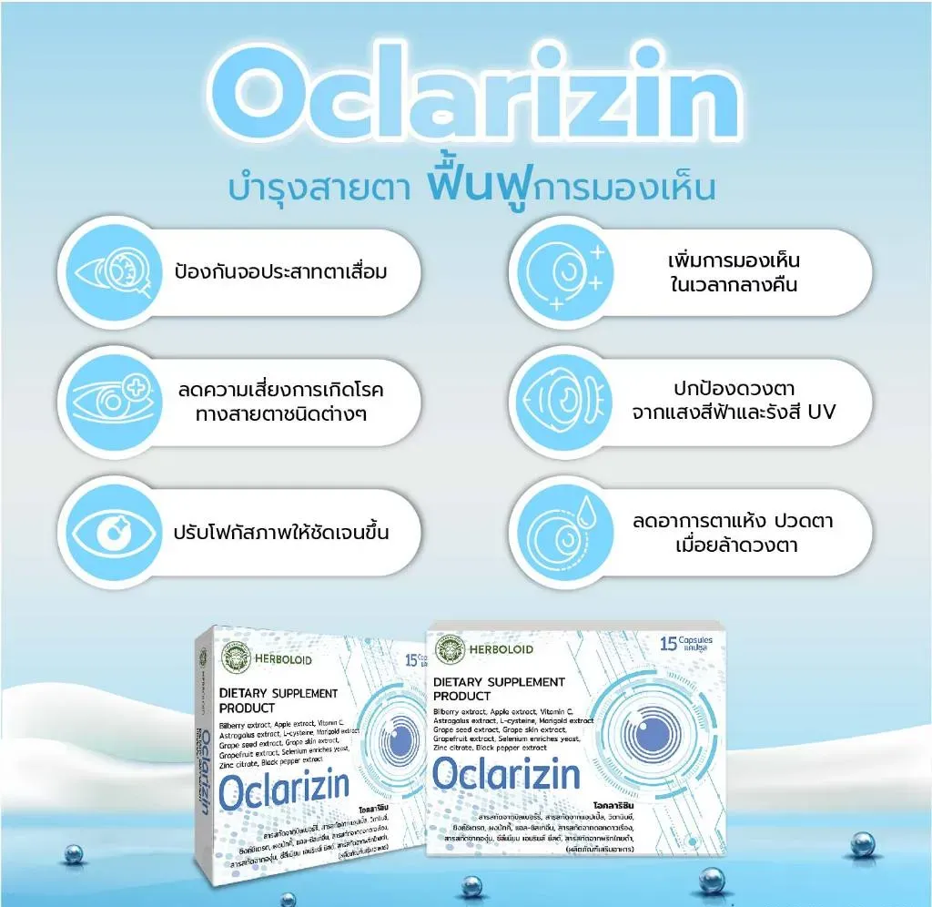 ” Oclarizin เป็นผลิตภัณฑ์ที่รวบรวมส่วนประกอบ เพื่อช่วยปกป้องดวงตาจากต้อชนิดต่างๆ การเสื่อมสภาพของเม็ดสี และโรคตาอื่นๆ ผู้ป่วยควรใช้ Oclarizin ตั้งแต่เนิ่นๆ เพื่อป้องกันและชะลอการลุกลามของโรค “